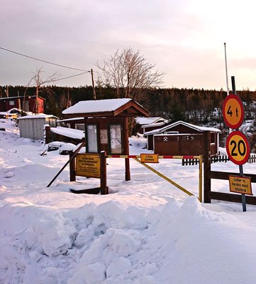 Vi kör sakta genom området, och stänger bommarna efter oss.